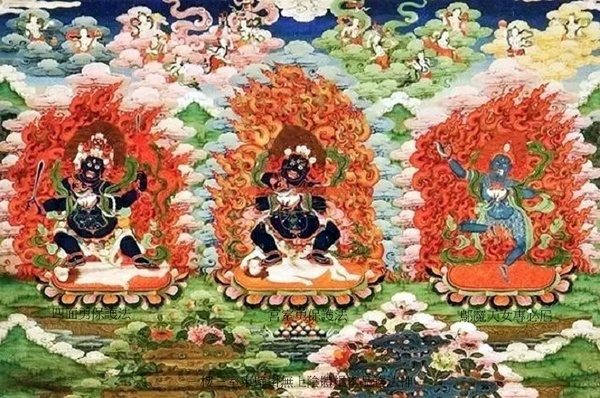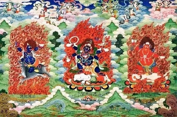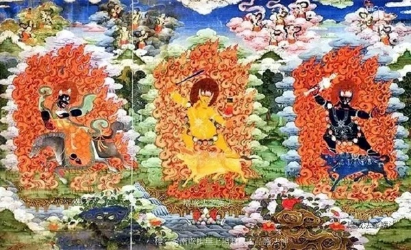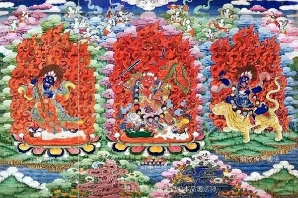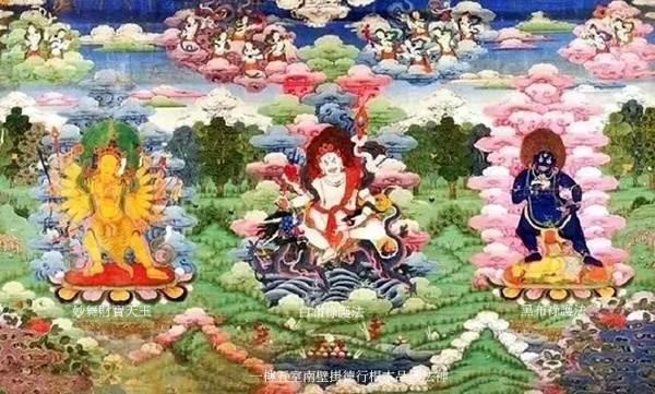 正中增盛法帝護法,黃色身,牛首人身,立於黃牛背上;左側大黑雄威護法,持嘎巴拉碗,藍黑色身,騎黑馬;右側雄威法帝護法,藍黑色身,牛首人身,立於藍牛背上.
