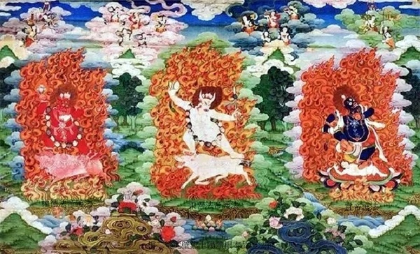 正中為值夏天母,一面二臂紅色身,手持鉞刀和嘎巴拉碗,騎紅色牛;左側雄威天母護法,一面二臂藍色身,身披人皮,騎青色騾子;右側值冬天母護法,藍色身,騎灰色駱駝.