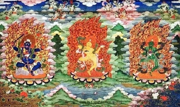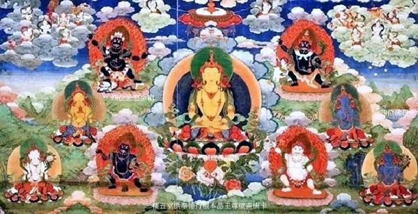 正中白布祿護法,一面二臂白色身,右手持三叉戟,左手持吐寶鼬,坐於水中升起的龍背上;左側妙舞財寶天王,黃色身,三頭十六臂,立於蓮花座之上;右側黑布祿護法,藍黑色身,右手持聚寶盆,左手持吐寶鼬,立於蓮台之上.