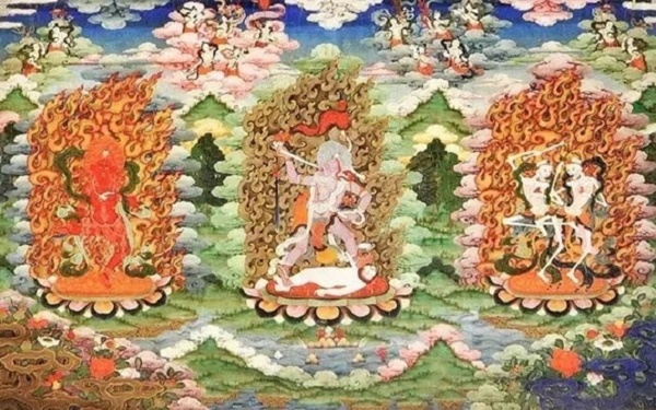正中婆羅門勇保護法,皓首長須,一面三目,手持腿骨號、鉞刀和嘎巴拉碗,踏人屍立於蓮台之上;左側鄔魔天女喇克義西,紅色身,手持鉞刀和嘎巴拉碗立於蓮台之上;右側屍陀林主,為一對舞蹈的白色骷髏,是墳場的護法神.