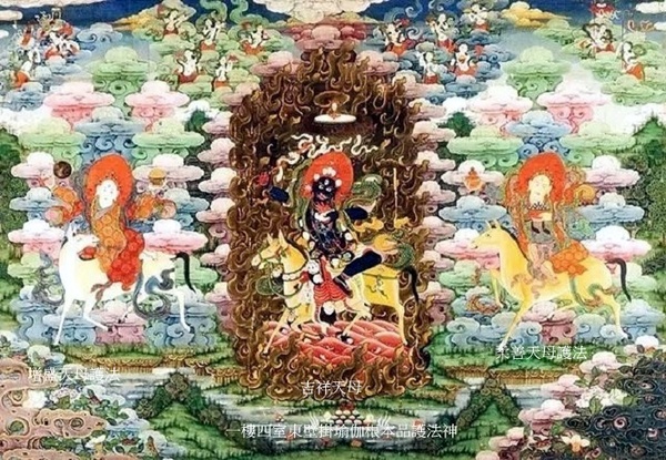 中間為主神吉祥天母,藍黑色身,騎黃色騾子;左側增盛天母護法,手持金碗和鼓,騎白色騾子;右側柔善天母護法,手持寶瓶和珍寶碗,騎黃色騾子.