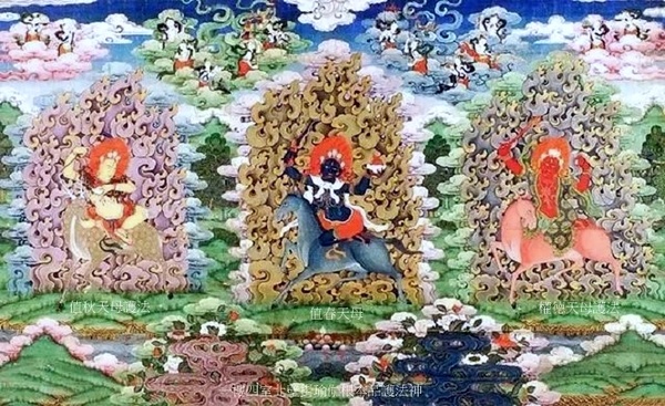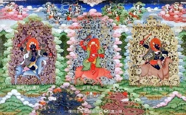 正中為值春天母,藍黑色身,一面三目二臂,身披人皮,手持鉞刀和嘎巴拉碗,騎青色騾子;左側值秋天母護法,一面二臂黃色身,持鋤和嘎巴拉碗,騎梅花鹿;右側權德天母護法,紅色身,一面二臂,手持鉞刀和金剛索,騎紅色騾子.