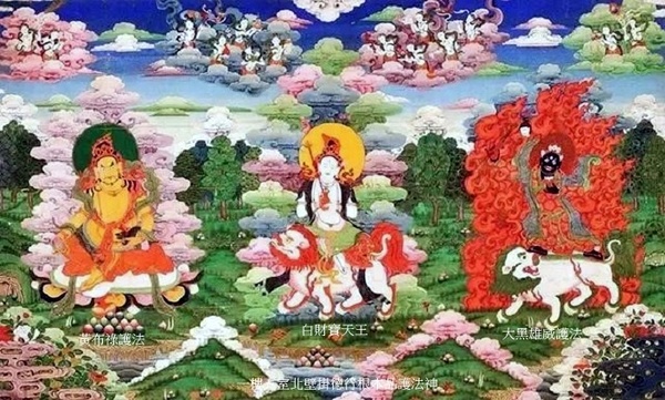 正中白財寶天王,一面二臂白色身,手持金剛鉤和寶瓶,坐紅鬃白獅子上;左側黃布祿護法,黃色身,左手持吐寶鼬,右手持摩尼寶,腳踩白海螺坐於蓮花座上;右側大黑雄威護法,一面二臂藍黑色身,著長袍,右手持掛人頭的三叉戟,左手握人心,立於綠鬃白獅子背上.