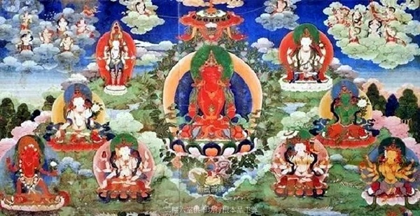 畫面正中為宏光顯耀菩提佛,黃色身,結禪定印結跏趺坐於蓮花寶座之上.左右分別為伏魔手持金剛佛、善行手持金剛佛、黑摧碎金剛佛、白馬頭金剛佛、佛眼佛母、嘛嘛基佛母、白衣佛母、青救度佛母.(四位忿怒金剛,四位佛母.)