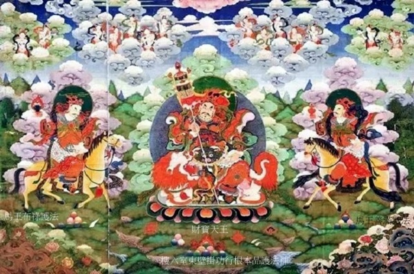 正中財寶天王,黃色身,著鎧甲,右手持寶幢,左手持吐寶鼬,坐於白獅子上;左側馬王布祿護法,右手持摩尼寶,左手持吐寶鼬,騎黃馬;右側馬王善滿護法,右手托寶瓶,左手持吐寶鼬,騎黃馬.