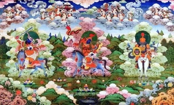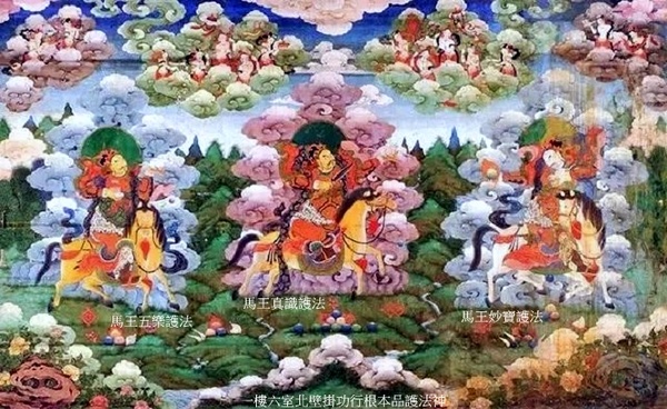 正中為馬王真識護法,黃色身,右手持彎刀,左手持吐寶鼬,騎黃馬;左側馬王五樂護法,黃色身,右手托宮殿,左手托吐寶鼬,騎黃馬;右側馬王妙寶護法,右手持摩尼寶,左手持吐寶鼬,騎白馬.