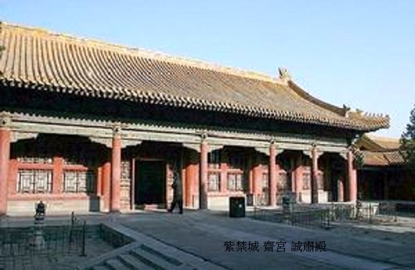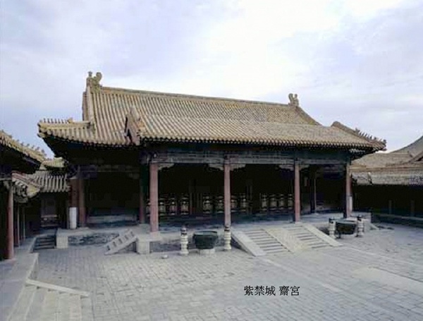齋宮系前朝後寢兩進的長方形院落.前殿齋宮,面闊5間,黃琉璃瓦歇山頂,前出抱廈3間,明間、兩次間開隔扇門,兩梢間為檻窗.殿內正中上懸乾隆御筆“敬天”匾.室內渾金龍紋天花,正中為八角形渾金蟠龍藻井.東暖閣為書屋,西暖閣為佛堂.東西各有配殿3間.正殿左右轉角廊與配殿前廊相連,形成三合院帶轉角的格局.後寢宮初名孚顒(ㄧㄥˊ)殿,就是肅靜’景仰的殿名.改為誠肅殿恰如其分.凡祭天祀地及祈谷、常雩(ㄩˊ;求雨的祭祀)大祀前,皇帝致齋于此.遇皇帝宿齋宮,恭設齋戒牌、銅人于齋宮丹陛左側.齋戒日,皇帝與陪祀大臣佩戴齋戒牌,各宮懸齋戒木牌於簾額.齋戒期間,不作樂,不飲酒,忌辛辣.