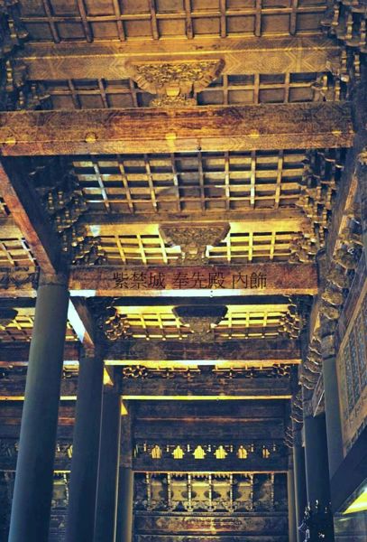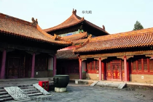 奉先殿為建立在白色須彌座上的工字形建築,四周繚以高垣.前為正殿,後為寢殿.前殿面闊9間,進深4間,建築面積1225.00㎡.黃色琉璃瓦重簷廡殿頂,簷下彩繪金線大點金鏇子彩畫.前簷中5間開門,為三交六椀菱花隔扇門,後簷中5間接穿堂,餘皆為檻窗.殿內設列聖列后龍鳳神寶座、籩豆案、香帛案、祝案、尊案等.後殿面闊9間,進深2間,建築面積755.00㎡。黃色琉璃瓦單簷廡殿頂,外簷彩畫亦為金線大點金鏇子彩畫.前簷中5間接穿堂,餘為檻窗.殿內每間依後簷分為九室,供列聖列后神牌,為“同殿異室”規制,各設神龕、寶床、寶椅、楎椸(ㄏㄨㄟ ㄧˊ;掛物鉤及衣架),前設供案、燈檠(ㄑㄧㄥˊ;燈架).前後殿之間以穿堂相聯,形成內部通道.室內皆以金磚鋪地,渾金蓮花水草紋天花.殿前月臺寬40.00m,深12.00m,總面積500.00㎡,陳設日晷、嘉量.須彌座及月臺四周設欄板、龍鳳紋望柱.無配殿、廡房,僅在殿前奉先門外正南有群房13間,為神庫、神廚.東一小院,內有一座3間的小殿,為明嘉靖帝朱厚熜為奉其父興獻王朱祐杬而建.
