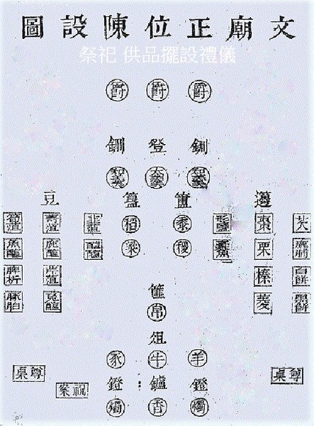 祭天進饌大典宗器用於宗廟祭祀之禮.禮器, 青銅器禮器數量多,可分為炊器、食器、酒器、水器、樂器.籩豆案上食器的陳設次序.登在中間,鉶設兩旁,左簋右簠,籩從簠,豆從簋,俎在案前.同時俎用單數,籩豆用雙數,以體現陰陽之義.祭天祭器凡瓷用青.鉶(ㄒㄧㄥˊ;xing)、簠、簋、籩、豆、篚、爵(酒器)這七樣都是古代常用的食器,在典禮中用來盛裝給孔子的祭品,每種食器都有規定不同盛裝的東西,擺置的位置也有規定.只有孔子有登.配享及東西廡無登.這些食器,比起今日的食器,形體都略長且略高大,這是因為古代人都席地坐著進行,他們食器形狀與今日不同,但一樣是作為日常生活的器具.典禮開始前,這些盛裝好祭品的祭器都會擺好,在典禮的進饌儀式中,由禮生象徵性的移動一下再擺回原位.