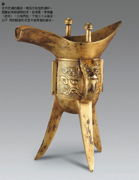 古代飲酒的器皿,相當於後世的酒杯.圓腹前有傾酒用的流,後有尾,旁有鋬(把手),口有兩柱,下有三個尖高足,以不同的配套形狀顯示使用者的身份.