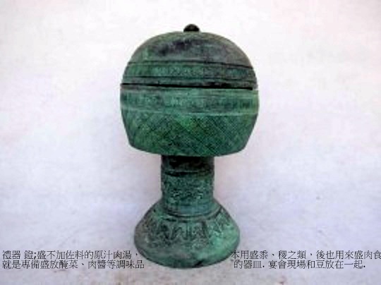 盛不加佐料的原汁肉湯,本用盛黍、稷之類,後也用來盛肉食,就是專備盛放醃菜、肉醬等調味品的器皿.高:30公分 口徑:19.5公分.