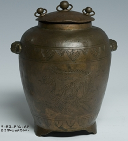 音為形,一對,分置登的左右,鉶為兩耳三足有蓋的鼎狀容器.古時盛裝羹的小鼎.高:28公分 口徑:19公分.