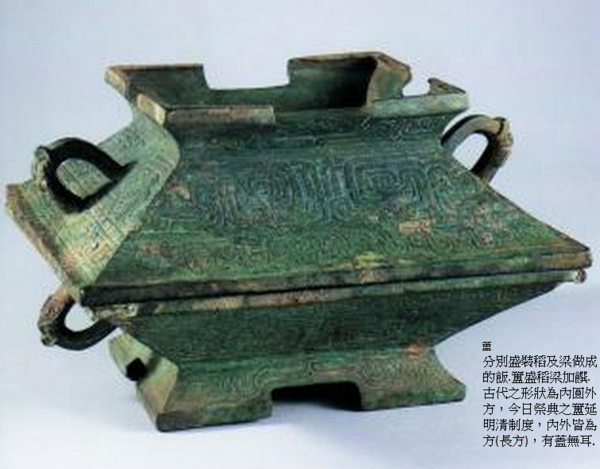 ,簠盛稻梁加饌.古代之形狀為內圓外方,今日祭典之簠延明清制度,內外皆為方(長方),有蓋無耳,鉛製.長:27.7公分 寬:19.2公分 高:17公分.