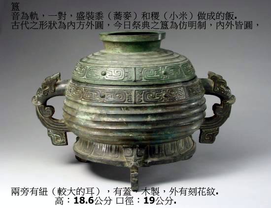 音為軌,一對,盛裝黍(蕎麥)和稷(小米)做成的飯.古代之形狀為內方外圓,今日祭典之簋為仿明制,內外皆圓,兩旁有紐(較大的耳),有蓋,木製,外有刻花紋.高:18.6公分 口徑:19公分.