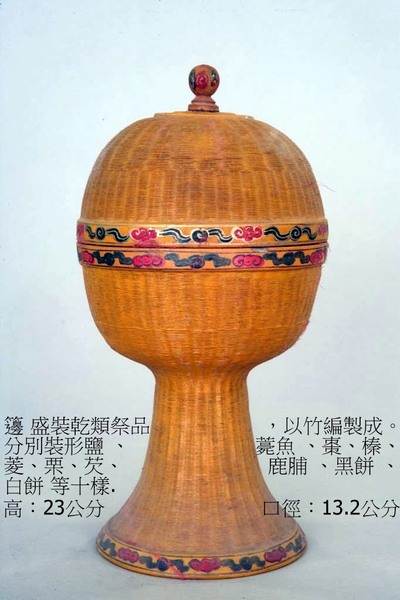 音為邊,十個,放置在面向牌位的右手邊,盛裝乾類祭品,以竹編製成.分別裝形鹽 、薧魚(薧ㄎㄠˇ;乾的食物)、棗、榛、菱、栗、芡(ㄑㄧㄢˋ; 澱粉)、鹿脯 、黑餅 、白餅 等十樣. 高:23公分 口徑:13.2公分.