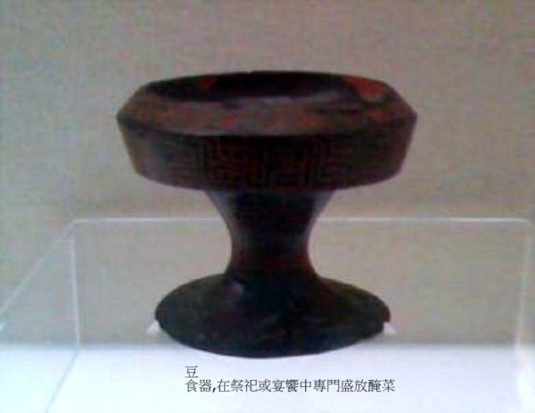 十個,放置在面向牌位的左手邊,盛裝帶汁的菜、肉,為木製,形狀與籩相似.分別裝韮菹(ㄐㄩ;醃菜’鹹菜)、芹菹、筍菹、菁菹(ㄐㄧㄥ;醃韭菜花)、醓醢(ㄊㄢˇ, ㄏㄞˇ;醃漬肉醬)、鹿醢、兔醢、魚醢 、脾析(ㄆㄧˊ ㄒㄧ;牛胃)、豚胉(ㄊㄨㄣˊ ㄅㄛˊ;豬牲體的兩脅)等十樣.高:24.3公分 口徑:14.6公分.