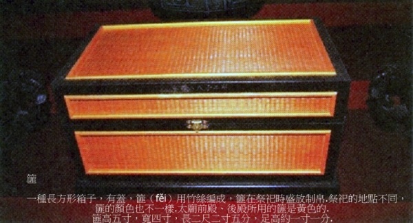 一種長方形箱子,有蓋,篚(fěi)用竹絲編成,篚在祭祀時盛放制帛.祭祀的地點不同,篚的顏色也不一樣.太廟前殿、後殿所用的篚是黃色的.篚高五寸,寬四寸,長二尺二寸五分,足高約一寸一分.