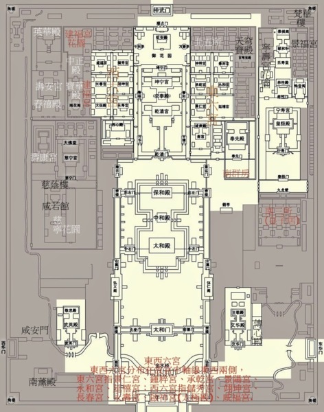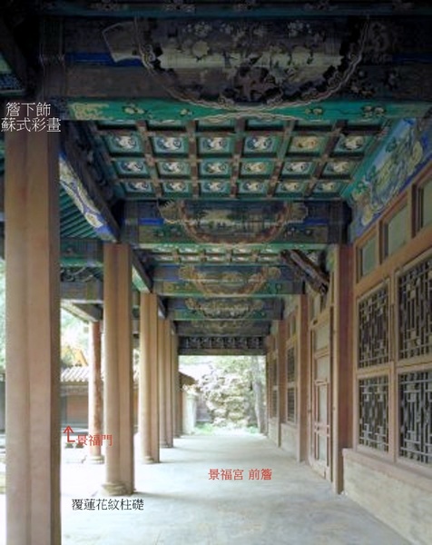 景福宮是寧壽宮東路的主體建築,其北為梵華樓,西與中路景祺閣相望.宮與周圍建築之間靈活安插遊廊與虎皮石牆,形成了既相對獨立,又彼此連通的建築環境.為園中之寢,其建築形式與園林建築相和諧,或許是宮殿中帶園林的一種過度形式.