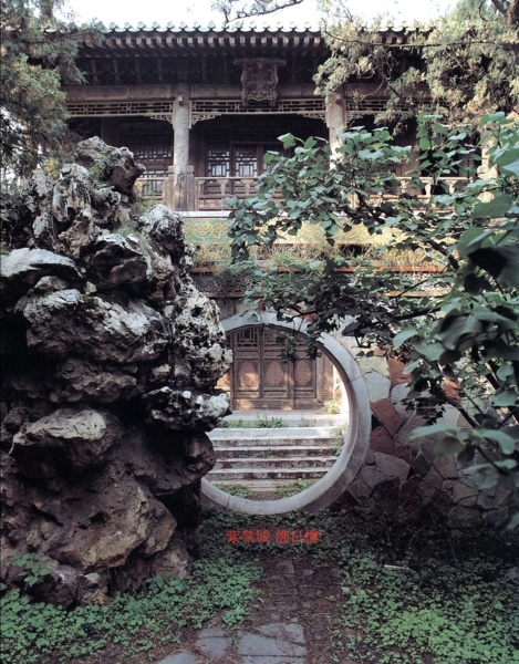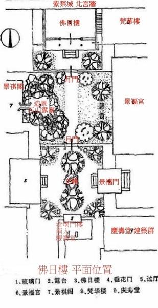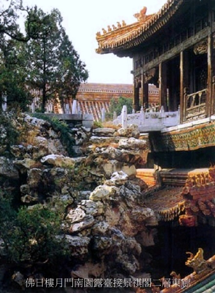 佛日樓前用虎皮石飾面牆圍繞形成小院,小院開有月亮門,門外便是景祺閣東院,東行可到達景福宮.