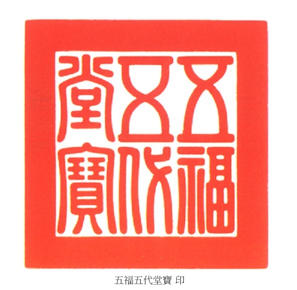 懸匾紫禁城景福宮內明間,乾隆四十九年(1784),乾隆帝喜得玄孫,一堂五世,故於乾隆五十二年(1787)親書“五福五代堂”匾懸掛在景福宮內,並特作《五福五代堂記》:“茲蒙天貺(ㄎㄨㄤˋ. 釋義. 贈、賜與),予得元孫,五代同堂,為今古稀有之吉瑞.古之獲此瑞者,或名其堂,以餉其事.則予之所名堂,正宜用此五福之名.”同時命鐫刻多方“五福五代堂寶”璽以紀其事.不僅如此,乾隆帝又再書“五福五代堂”匾懸掛於避暑山莊東宮“卷阿勝境”殿內,並鐫“避暑山莊五福五代堂寶”.所有這些,都是對他“古稀有七,曾元繞膝”這一人生重大歷史的記錄.