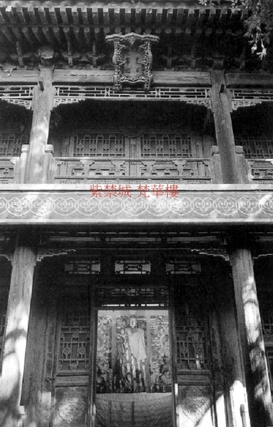 清乾隆三十七年(1772)建.位於寧壽宮區最北端,倚北宮牆而立,坐北朝南,七開間,二層樓,卷棚歇山頂. 松柏森森,環境幽靜,曲水流殤,緊湊而狹窄的庭院佈局,為梵華樓營造出佛堂靜謐的氛圍.雖為佛樓,梵華樓卻占盡良辰美景.門前正對一樓明間石通路連接景福宮後簷,東西兩側並有遊廊與景福宮相接.樓下明間供旃檀佛銅像,高二點一米.東西各三室,分別供乾隆三十九年(1774)造掐絲琺瑯大佛塔六座,造型各異,豪華精美.塔周圍三面牆掛通壁大幅唐卡,畫護法神五十四尊.各室中央均為天井,直通二層.二層繞天井設紫檀木圍欄,琺瑯塔頂正在天井中央.二層明間供木雕金漆宗喀巴像,其餘六間隔為六室,由西向東依次佈置為:一室般若品(顯宗部),二室無上陽體根本品(無上瑜伽部父續),三室無上陰體根本品(無上瑜伽部母續),四室瑜伽根本品(瑜伽部),五室德行根本品(行部),六室功行根本品(事部).每室主供密宗、顯宗主尊銅像,各九尊,供於北牆長案;東西壁為紫檀木千佛龕,內供一百二十二尊小銅像.六室供佛合計七百八十六尊.