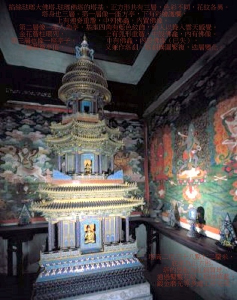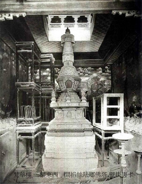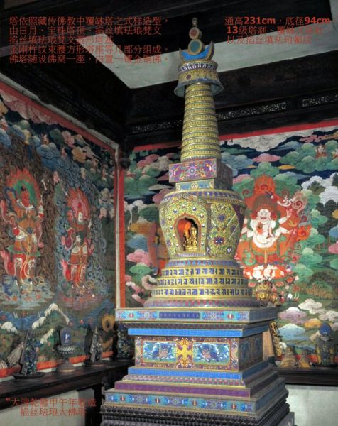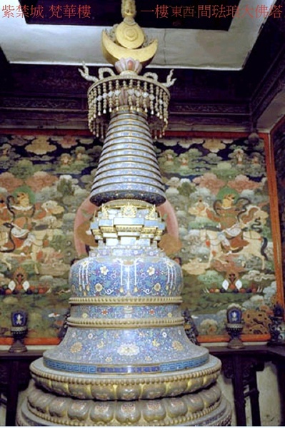 故宮有一座佛樓,日本人搶不走燒不毀,進門要請仙,至今仍然封存.在清乾隆三十九年(1774)和乾隆四十七年(1782)共造了十二座琺瑯塔.製作規模,所耗費人力、物力,及高超製作技術都堪稱明清兩代掐絲琺瑯製作之最.這十二件巨大佛塔分別陳設于紫禁城東北的梵華樓與西南的寶相樓內,其高度相同而形制各異.這十二座雄偉琺瑯佛塔需要眾多工匠進行紛繁工藝協作,工程龐雜,作為空前巨大琺瑯精品,其顯示乾隆年間殷實國力和高度成熟琺瑯工藝.十二座塔成為秘藏深宮巨型珍寶,也是乾隆盛世傑出之作.