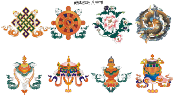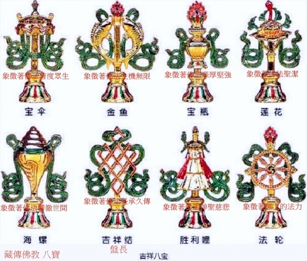 又稱八吉祥,象征佛教威力的八種物象.由八種識智即眼、耳、鼻、音、心、身、意、藏所感悟顯現.描繪成八種圖案紋飾.作為佛教藝術的裝飾.清代乾隆時期又將這八種紋飾製成立體造型的陳設品.常與寺廟中供器一起陳放.八吉祥簡稱輪、螺、傘、蓋、花、罐、魚、長.