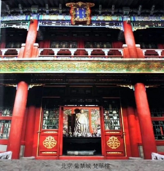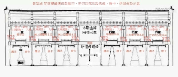 梵華樓建築、陳設形式是清宮廷佛堂一種重要模式,清宮檔案中稱之為“六品佛樓”.所謂“六品”,是指藏傳佛教修行所必須經過的六個部分,即般若品、事部、行部、瑜伽部、無上瑜伽部,後面這四部是藏傳佛教修密宗的四個部分,也是修行的四個階梯,其中無上瑜伽部又分為父部和母部,供奉不同的神,按不同的佛教經典修行,一共就是六部.