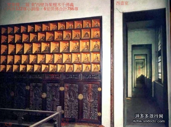 佛日樓一層分隔成數個室,供奉著藏傳佛教五大密宗主尊(密集金剛、上樂金剛、大威德金剛、喜金剛、時輪金剛)、五方佛、釋迦牟尼佛.二層供奉著三世佛(釋迦牟尼佛、燃燈佛、彌勒佛)、十八羅漢、四大天王,北壁、東壁、西壁設有長條供案,案上供奉378尊無量壽佛小銅像.