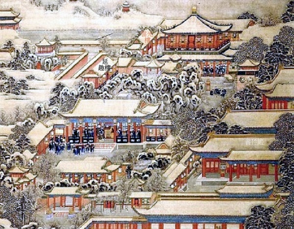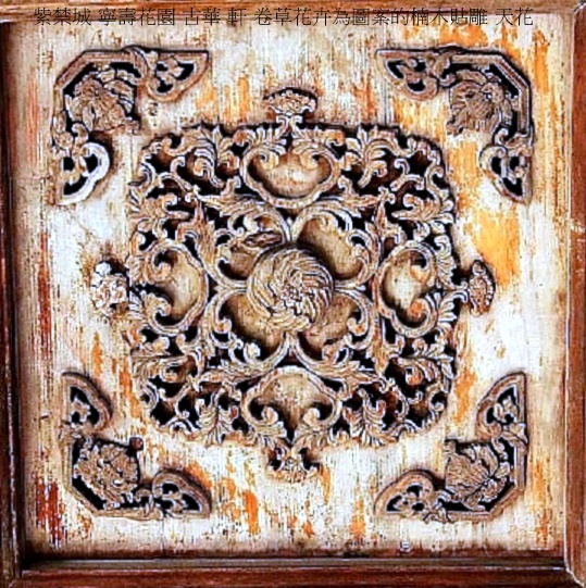 西路龍潛,東路歸田;奢中極美,美中極精.花園內最著名的內檐裝修和建築裝飾當屬倦勤齋,有規模巨大的天頂畫,全景畫則將園林景觀繪於室內,占據西側四間的牆面,如此,乾隆皇帝在隆冬時節依然能在倦勤齋內看到春天景象,而且畫面與窗外景色相似,如同照影,設置巧妙.西四間中心是一座小型戲台,戲台對面有觀戲的上、下雙層寶座,戲台雖小,但音效極好. 倦勤齋西四間亭式室內戲臺,最重要的裝飾是通景畫.通景畫的繪畫手法來自於歐洲教堂的天頂畫和全景畫,上承棚頂,下接四壁,畫面連綿一體,是一種與中國傳統繪畫毫無瓜葛的環境藝術.與教堂繪畫不同的是,倦勤齋通景畫的畫意不是疏離人間,而是親近生靈,四壁繪畫與周圍景色協調一致.