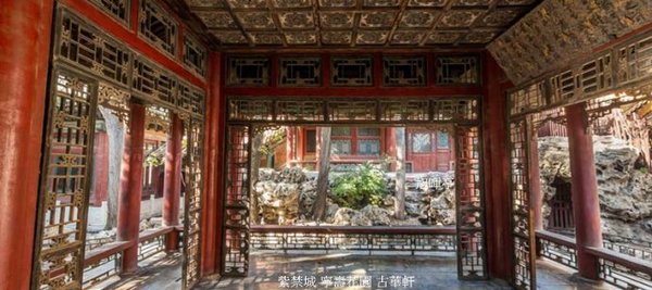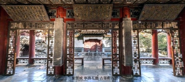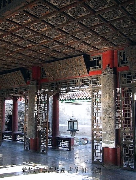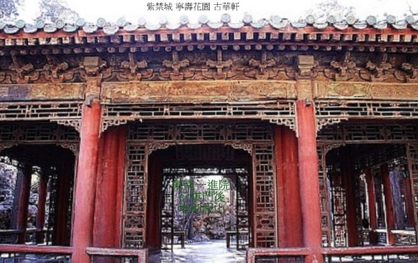 寧壽宮花園第一進院落的主體建築.建於乾隆三十七年(1772年).軒為座北面南的敞軒,鮮豔虎皮飾石基台,面闊3間帶回廊,正面懸掛乾隆帝御筆“古華軒”木匾.卷棚歇山式頂,黃琉璃瓦綠剪邊.簷柱間置倒掛楣子與坐凳,金柱間安裝透空燈籠錦落地罩,用以界分內外,形成內外空間的貫通.