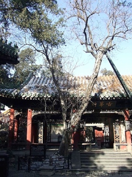 軒明間內簷和後簷4間懸掛木雕龍匾4塊,明間楹聯一副,均是乾隆帝為古楸而題.軒前簷下有古楸一株,正是先有了這棵古楸,乾隆皇帝才決定在這裡建一座敞軒.古華軒的對聯日'明月清風無盡藏,長楸古柏是佳期'.構軒時樹齡已逾百年,倚樹建軒,故名“古華軒”.