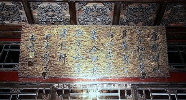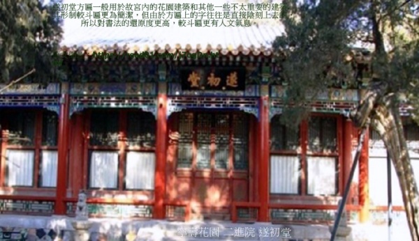 一般用於故宮內的花園建築和其他一些不太重要的建築.其形制較斗匾更為簡潔,方匾上的字往往是直接陰刻上去的,所以對書法的還原度更高,較斗匾更有人文氣息.