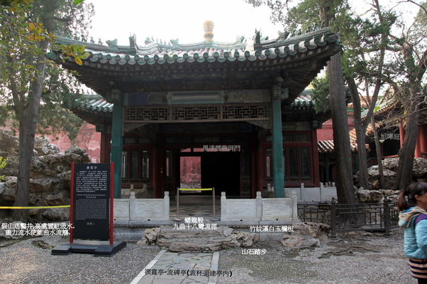 亭的內外裝修均飾竹紋,以象徵王羲之蘭亭修禊時“茂林修竹”之環境,恰切地烘托了建築主題.亭前壘砌具有亭園情趣的山石踏步,亭簷下以刻有竹紋的漢白玉欄板圍護,渲染了幽雅閒適的意境.