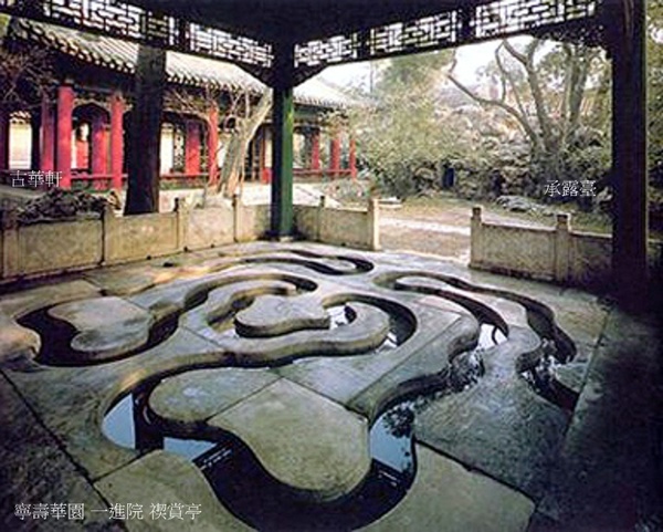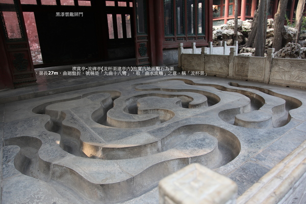 禊賞亭抱廈內地面鑿石為渠,渠長27m,曲廻盤折,取“曲水流觴”之意,稱“流杯渠”.渠水來自亭南側假山後掩蔽的水井,汲水入缸,經假山內暗渠流入渠內.