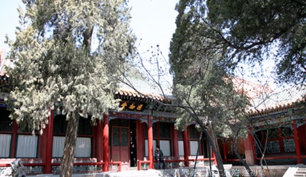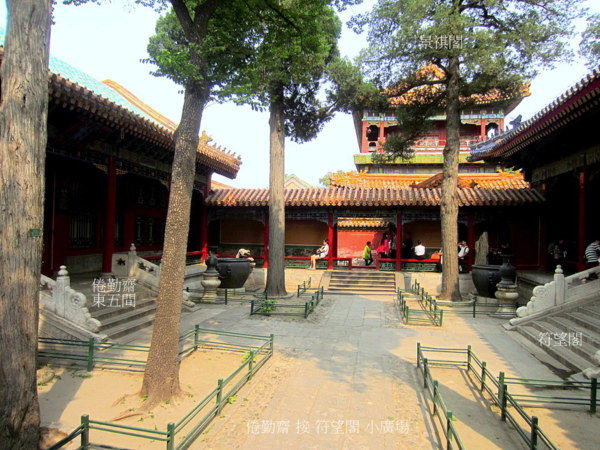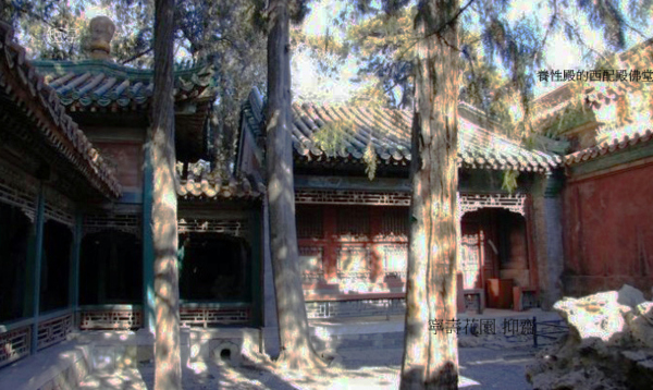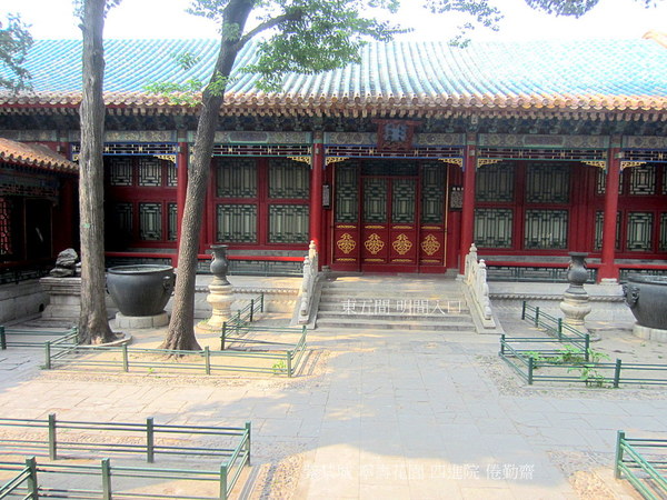 齋前由東西兩段遊廊隔成一個方整幽雅的庭院,院中古柏聳立,有十字方磚甬路,可以行進.西4間前一弧形院牆,中開八方門,通往竹香館.現建築完好,東5間辟為遊覽之地.
