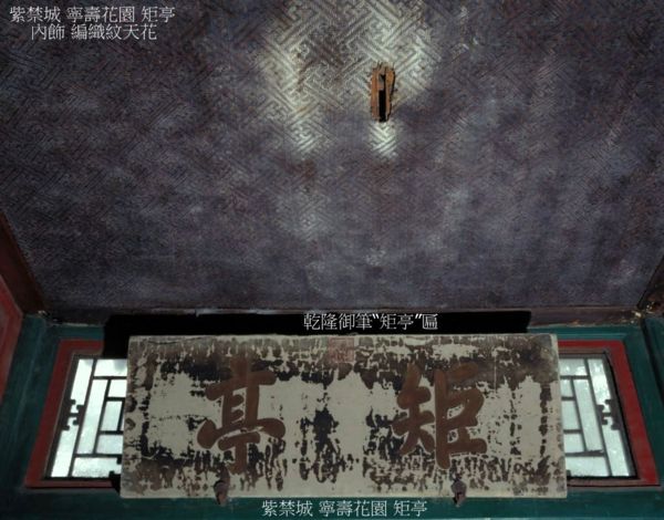 位於外東路寧壽宮花園第一進院,抑齋西側,清乾隆三十七年(1772年)建.亭為方形,座西朝東,四角攢尖綠剪邊黃琉璃瓦寶頂.簷下飾以蘇式彩畫.亭內西面為遊廊檻窗,上懸乾隆御筆“矩亭”匾,頂部是編織紋天花,為宮內僅有.矩亭南、北、東三面接遊廊,向南可通衍祺門,向北可達露臺,向東可到抑齋.