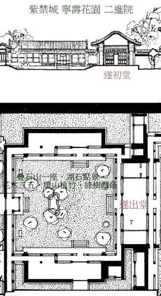 遂初堂面闊5間,進深3間,坐北面南,黃琉璃瓦卷棚歇山頂,綠琉璃瓦剪邊,前後出廊.前廊下懸乾隆御筆滿漢文“遂初堂”匾.中間開門,餘開支摘窗.明間為過廳,穿廳而過可至寧壽宮花園的第三進院落.左右出轉角遊廊,與東西配房前廊相通.東西配房各5間,北3間明廊,中間開門,南2間為暗廊.配房南端出廊,與院牆垂花門的倒座遊廊相接.外簷均飾蘇式彩畫,虎皮石牆基.正房、東西配房及轉角遊廊、廊房相連,圍成一座方正的庭院.院門為四扇綠漆的垂花門.院內疊石山一座,湖石點景,花木三五,環山植竹,綠樹翠蔭,海墁地面中鋪設方磚通路,以連通正房與東西配房.
