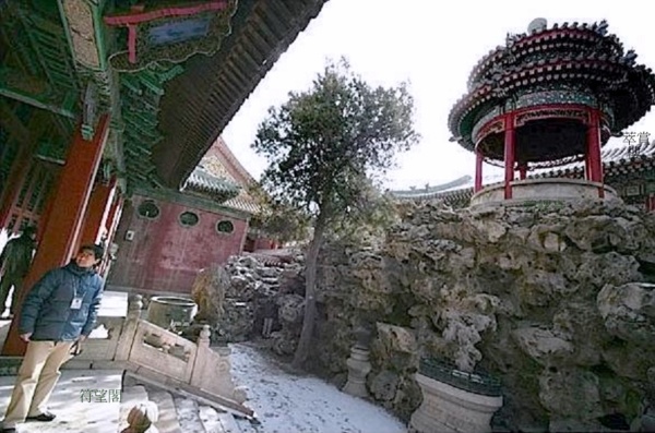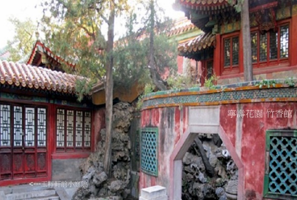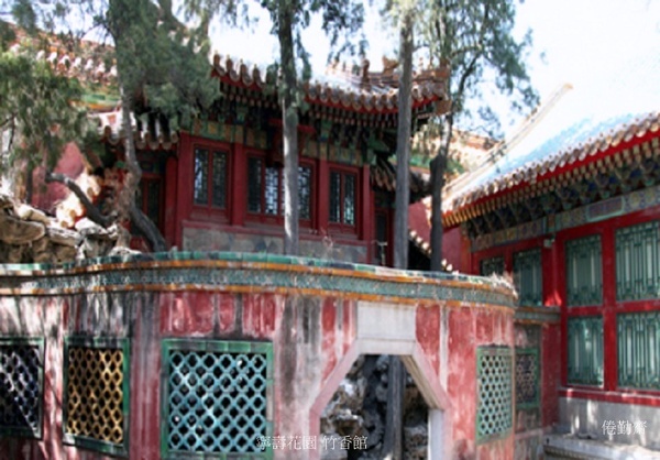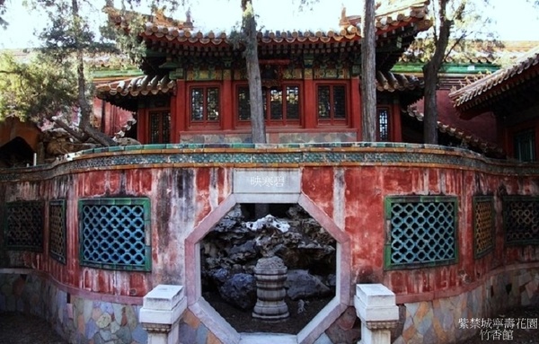 符望閣西北有一處圍起來的假山,其內有座小樓亭,西倚宮牆,面東而立,名為"竹香館",八角門上刻著"映寒碧"三字,清乾隆三十七年仿建福宮花園碧琳館而建.
