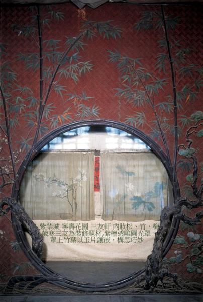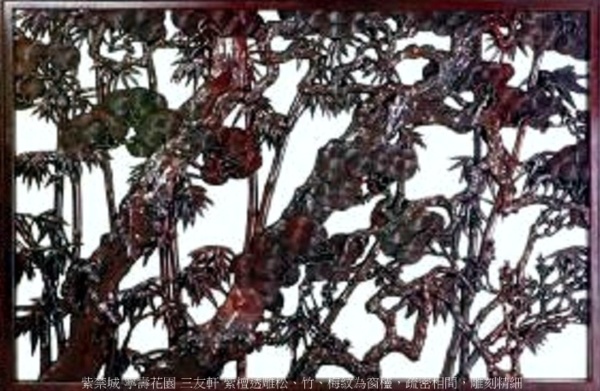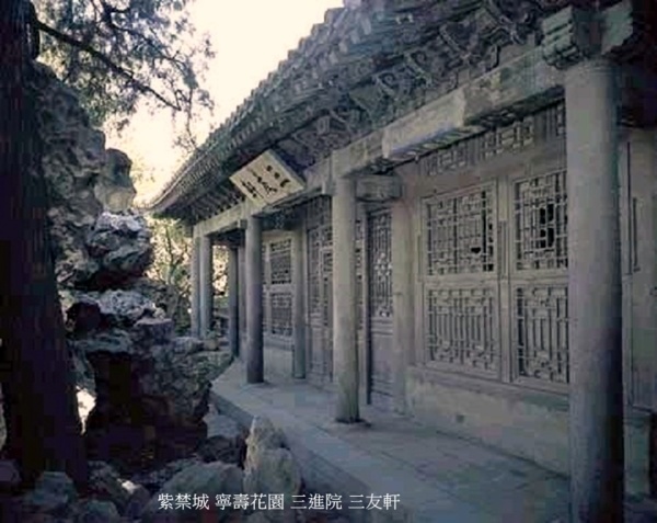 三友軒為院落東側,座北面南,三開間式小軒.清乾隆三十九年(1774年)建.黃琉璃瓦捲棚頂,東為硬山式,西為歇山式,三面出廊,一種巧借地形的屋頂構造形式,為宮中僅有.軒明間槅扇4扇,中間兩扇為門,簷下掛匾“三友軒”,兩次間為燈籠錦支摘窗.軒內以松、竹、梅歲寒三友為裝修題材,尤為奪目的是紫檀透雕圓光罩,罩上竹葉以玉片鑲嵌,構思巧妙.東為3扇支摘窗,與樂壽堂隔窗相望.後簷皆為支摘窗,窗外為假山.西次間西牆闢窗,以紫檀透雕松、竹、梅紋為窗櫺,疏密相間,雕刻精細.透過西窗,可觀賞窗外玲瓏的假山與翠竹青松.三友軒的裝修題材與軒外的種植物匹配,內外松’竹’梅,渲染突出了建築主題.