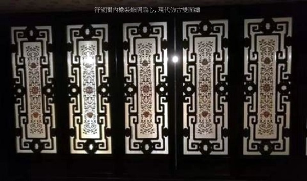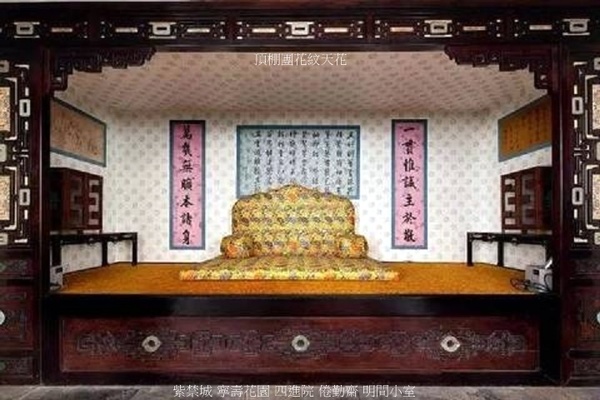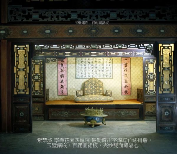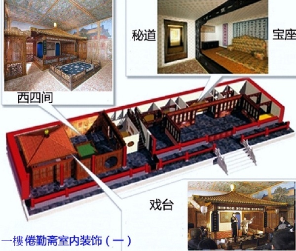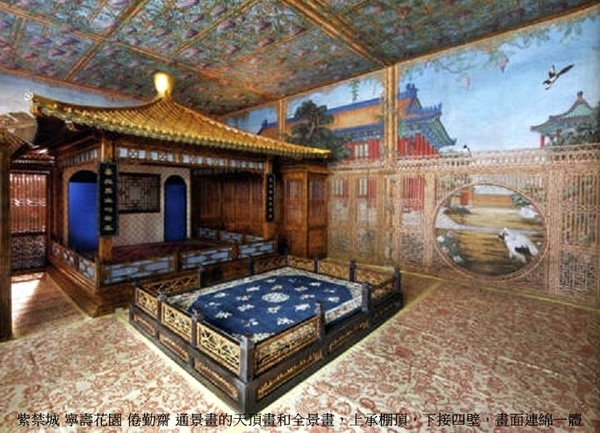 室內裝修頗具特色,室內陳設;床榻眾多,可隨時坐臥,而且空間狹小、家具少,便於老年人居住.又以各種不同類型的裝修巧妙地分隔空間,穿門越檻之際,往往迷失方向,故俗有“迷樓”之稱.室內裝修製作精美,有雕漆、漆嵌螺鈿、百寶鑲嵌等工藝,使用鍍金、琺瑯、漆器’絲織文物等材質,鑲嵌裝飾,構成博古圖、冰梅紋等圖案和紋樣.琳瑯滿目,美不勝收.