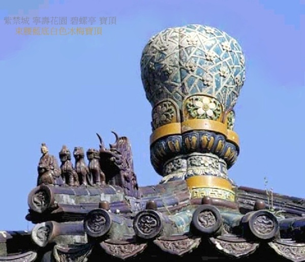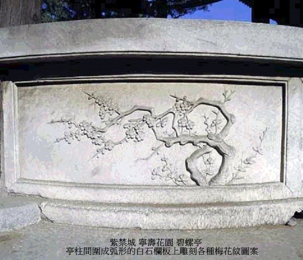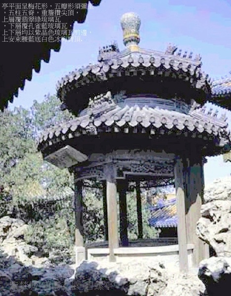 位於寧壽宮花園符望閣前的疊山主峰之上,因其形制似梅花,構件亦以梅花紋裝飾,又稱碧螺梅花亭,建於清乾隆三十七年(1772年).亭平面呈梅花形,五瓣形須彌座,五柱五脊,重簷攢尖頂,上層覆翡翠綠琉璃瓦,下層覆孔雀藍琉璃瓦,上下層均以紫晶色琉璃瓦剪邊,上安束腰藍底白色冰梅寶頂.每層五條垂脊,分為五個坡面,仿梅之意.亭柱間圍成弧形的白石欄板上雕刻各種梅花紋圖案.柱簷下安裝透雕折枝梅花紋的倒掛楣子.亭內頂棚為貼雕精細的梅花圖案天花.上下簷額枋彩畫為點金加彩折枝梅花紋蘇式彩畫.亭前簷下懸乾隆禦筆“碧螺”匾.亭南架一石橋,通萃賞樓二層,東西有石階,可通山下.