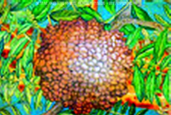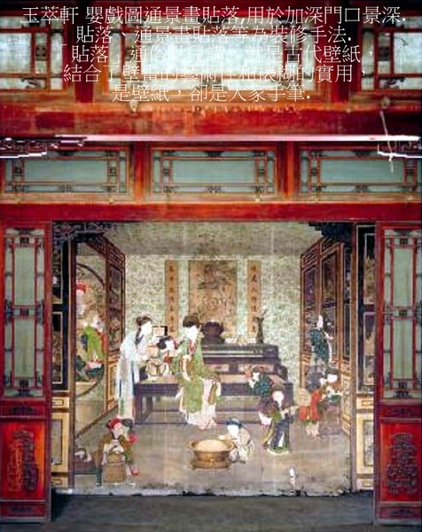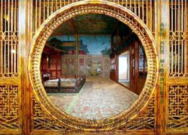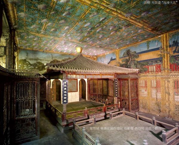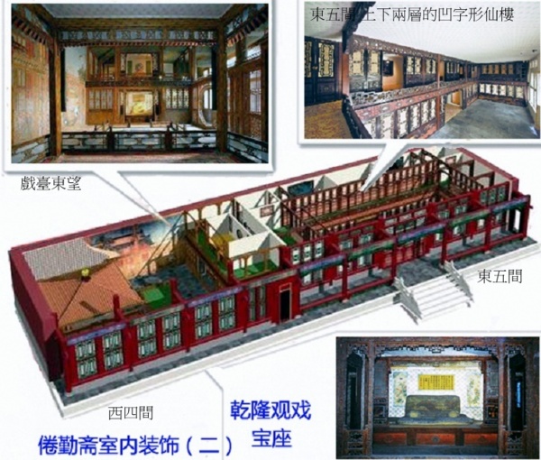 西4間,頂棚飾以竹架藤蘿的海墁天花,周圍竹籬環繞,樓閣間白鶴起舞,喜鵲嬉戲,姚黃魏紫(淒美的牡丹故事),爭芳鬥豔,使人仿佛置身于天然美景中,實為裝飾室內的通景畫.此畫出自乾隆年間宮廷畫師郎世甯、王幼學之筆,裱糊於室內牆壁,一掃丹柱椒壁之莊嚴單調.南立一楠木雕彩繪竹紋圓光罩,與北牆裱糊的彩繪竹籬圓光罩遙相對應.西側一方形小亭戲台,座西面東.亭為木質仿竹紋,亦稱竹亭.四角攢尖式頂,上置塗金木寶頂.亭南與亭後有木質仿竹夾層籬笆.後簷兩側設門,供上下場用,此為倦勤齋小戲臺,為太上皇在室內觀戲而建.亭前亦設一仙樓,面西,正中上下均設寶座床,為觀戲時所用.乾隆時,南府太監常在此演唱岔曲.