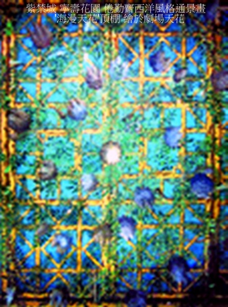 倦勤齋的天頂畫和全景畫是由義大利傳教士郎世甯的中國弟子王幼學,在郎世寧原稿的基礎上完成的,時間是在乾隆三十九年(1774年),是盛清時代風行於皇宮的西洋風格通景畫“海漫天花”繪頂棚,驚豔西洋立體幻覺.頂棚上的畫面,繪成一座藤蘿架,架上藤蘿密佈,綠色枝條次第低垂,藍紫色的花朵星星點點.透過藤蘿架和枝幹花葉,從空隙中能見到藍藍的天空,這一切都是畫上去的.觀者如果站在戲臺前面的某一點抬頭向頂棚望去,其中藤蘿架上的一個花朵,正好懸在頭頂上,呈透視狀.而站在這個中心花朵下面向戲臺方向看去,會產生一簇簇藤蘿花從架上垂落的感覺.四壁繪畫與周圍景色協調一致。整個齋內有70余張畫,共約170平方米.