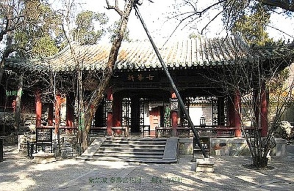 主體建築為古華軒,軒前一株古楸樹,軒因此得名.軒東山巒上有承露臺,軒西為鑿有流杯渠的禊賞亭,亭北山上有旭輝庭.軒南有假山,其間有曲徑.軒東南角有曲廊、矩亭、抑齋圍成的小院,院內東南堆砌假山,山上小亭名“擷芳亭”.