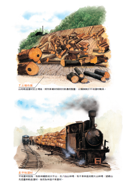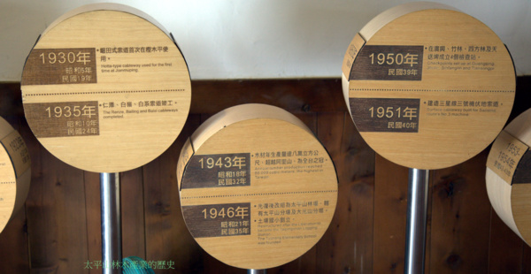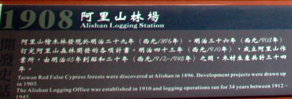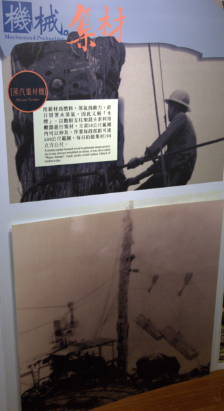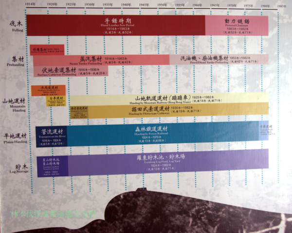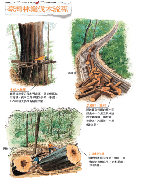 阿里山林場開拓最早,在大正元年(1912)就開始生產;其次為八仙山(台中東勢)林場,於大正四年(1915)開始生產;大正五年(1916)太平山林場加入生產.以林場的面積和總出材量來比較,排名依序是阿里山林場、太平山林場、八仙山林場.三大林場伐木種類以高山針葉林為主,如紅檜、臺灣扁柏等,現今日本明治神宮的鳥居木材就是採自臺灣丹大林區的檜木.