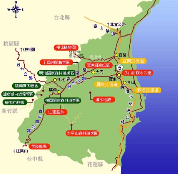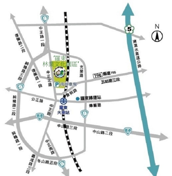 #5線高速公路羅東交流道下,接196線道抵中正北路’羅東林業文化園區’. 認識台灣森林由森林開發轉型為自然保育;森林林木伐採生產轉變為以森林遊樂、國土保安等維護環境的轉換歷史.涵蓋森產館’竹林車站、森林鐵路、生態池(松羅埤)、竹探館’機槍堡、儲木場、百年舊書攤、自然教育中心、運材蒸汽火車頭展示區及三百公尺長的五分仔鐵道展示、羅東林業管理處.