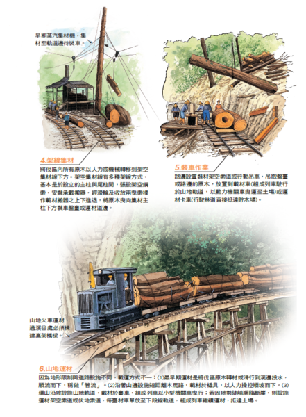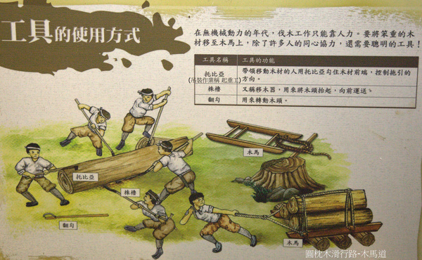 因為地形限制與道路設施不同,載運方式不一.太平山當初伐木、集材、運材與貯木等林業的情景:(1)最早期運材是將伐區原木轉材或滑行到溪邊投水,順流而下,稱做「管流」.(2)沿著山邊設施短距離木馬路,載材於橇具,以人力操控順坡而下.(3)環山沿坡設施山地軌道,載材於臺車,組成列車以小型機關車曳行;若因地勢陡峭瀕臨斷崖,則設施運材架空索道或伏地索道,每臺材車單放至下段線軌道,組成列車繼續運材,抵達土場.(手鋸時期伐木➡動力鏈鋸伐木➡修羅滑道集材➡各類火車集材➡ 木馬道運材➡台車運材➡山地軌道運材➡管流運材➡架空索道運材➡卡車運材)早期的原木運輸,尚無運材鐵路,搬運時均使用「木馬」來運輸木材.木馬路是從伐木山區開闢一條小路,然後在小路上鋪上一根根的圓形枕木,木馬路上搬運木材的工具-「木馬」,前方裝一條皮帶或粗麻繩,由人力拖木材下山.台灣在西元1912年開啟檜木林的利用,早期伐木以人力為主,在成片檜木森林地區修築木馬道,也就是以圓形枕木排成路軌,以人充牛、馬般,拖運木材於其上.拉木馬也是有技巧的,將背帶套到左肩,這樣右手可以控制方向軸,當下坡時,工人沒辦法煞車,才可以放棄木材逃跑,如果將背帶繞過頸部,那就必死無疑.但,即使是這麼小心,因為拉木馬而喪生的工人統計近30人,也因此拉木馬的工資又比大剖師傅高.