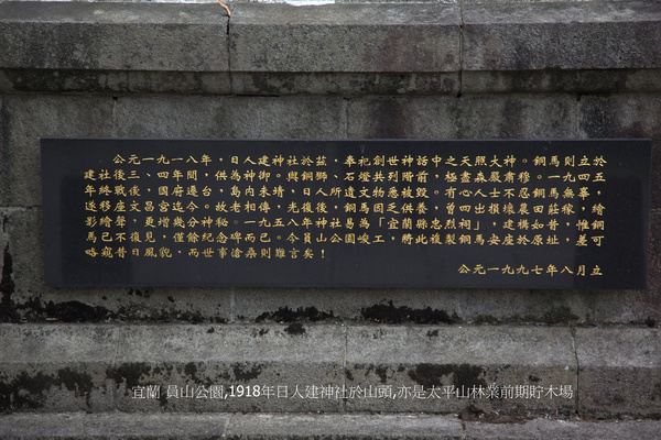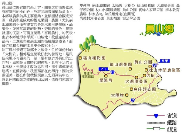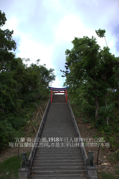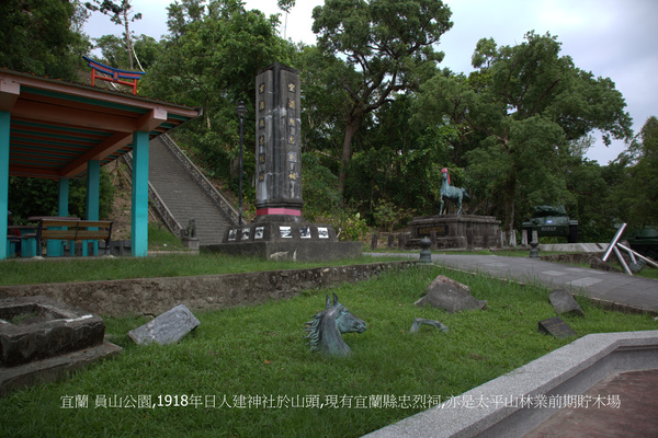 員山公園;1918年日人建神社於山頭,現有宜蘭縣忠烈祠,亦是太平山林業前期貯木場.園內有水生植物介紹,神社歷史及復健說明,赴福山植物園途中候站的好選擇.
