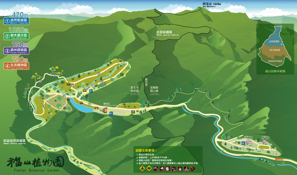 福山植物園就是展現高’低’中海拔樹種的園區,中低海拔植物居多,林業試驗所也必備雨量氣候觀測紀錄及苗圃.解說站西屋簷安裝攝像鏡頭,24小時轉播水生植物池及周遭植物’生態供全球參研.